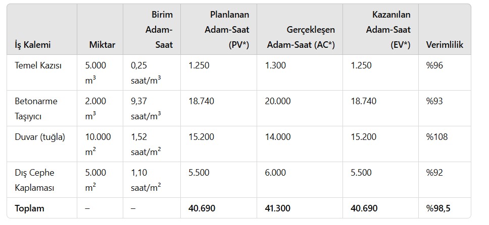 Çalışan Verimliliği: Verimlilik, çıktı / girdi şeklinde ölçülür; inşaatta genellikle saat başına iş miktarı ile ifade edilir. İş gücü verimliliğini analiz etmek için harcanan adam-saat (Spent Man-Hours) ile kazanılan adam-saat (Earned Man-Hours) karşılaştırılır. Kazanılan adam-saat, yapılan işin standartlara göre kaç adam-saat’e karşılık geldiğini (yani planlanana göre üretilen iş miktarını) gösterirken, harcanan adam-saat fiilen tüketilen emeği ifade eder. Bu karşılaştırma ile her bir iş kaleminde verimlilik yüzdesi hesaplanır. Örneğin, bir projede kalıp işinde 2500 saat harcanarak 2200 saatlik iş üretilebilmiş ise verim %88’dir (2200/2500). Buna karşılık demir montaj işinde 300 saatte 585 saatlik iş üretilmişse verim %195 gibi çok yüksek bir değerdedir. Toplamda tüm işler için örnek proje verimi %94,64 olarak hesaplanmıştır. Bu verimlilik yüzdeleri, işgücünün planlanana kıyasla ne kadar etkili kullanıldığını gösterir.