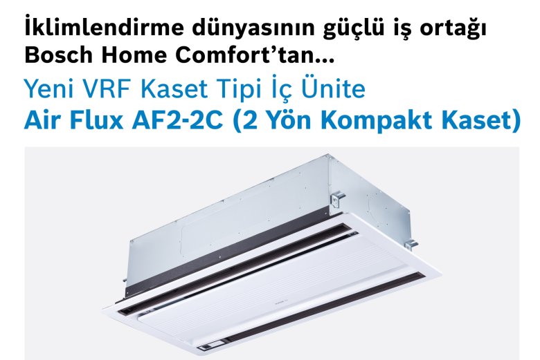 Bosch Home Comfort, iklimlendirme sektöründeki uzmanlığını ve teknolojik yeniliklerini yansıtan yeni ürünü Air Flux AF2-2C 2 Yönlü Kompakt Kaset Tipi İç Üniteyi pazara sundu. VRF klima sistemleriyle tam uyumlu olarak geliştirilen bu model, özellikle dar alanlar, uzun koridorlar ve holler gibi zorlu iç mekan koşullarına uygun çözüm sunuyor. Şık LED ekranlı paneli, modern çerçeve tasarımı ve enerji tasarruflu DC fan motoru ile hem estetik hem de yüksek performans arayan kullanıcılar için öne çıkıyor.
