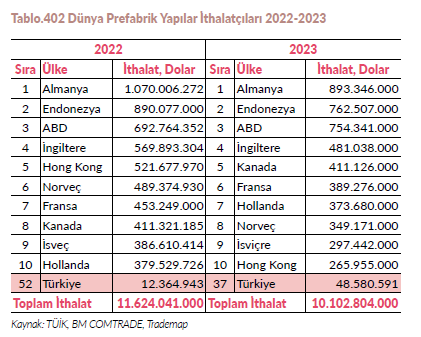 Dünya prefabrik yapılar ihracatı pandemi salgını sonrası hızlı artış göstermişti. 2023 yılında ise dünya ihracatı yüzde 5,4 azalarak 12,1 milyar dolara düşmüştür. Türkiye prefabrik yapı ihracatı ise 2023 yılında da artışına devam etmiştir. Böylece 2022 yılında yüzde 2,29 olan dünya prefabrik yapı ihracatı içindeki payımız 2023 yılında yüzde 2,46’ya yükselmiştir.
