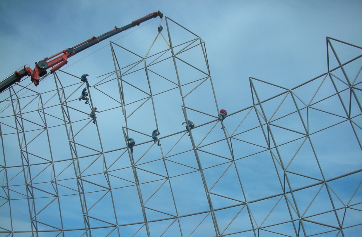 - Uzay sistem düşeyde 3 modül çevrede 4 modül olarak yerde parça parça örüldü, vinç yardımıyla bu parçalar yerlerine kaldırıldı, desteklere alındı ve havada montajı yapıldı.